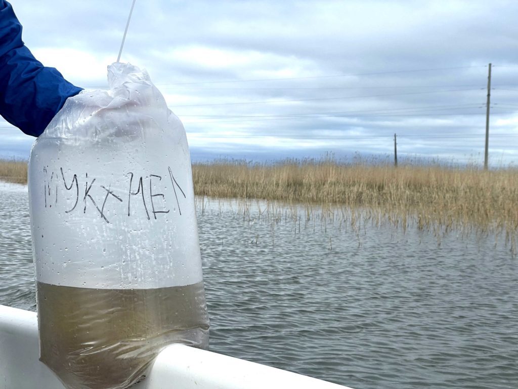 В этих пакетах личинки мукнела – гибрида муксуна и нельмы. Перед зарыблением они находятся в водоеме, чтобы температура воды внутри пакета сравнялась с озерной. Так будущая рыба быстрее адаптируется к новому месту.